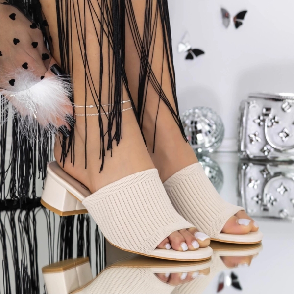 Γυναικείες παντόφλες μπεζ ανοιχτό με τακούνι από ύφασμα Raysa - Λεπτομέρειες προιόντος